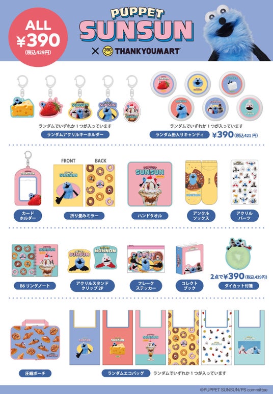「Be Smile, Be Kawaii」をテーマに、キャラクターの限定アイテムを中心としたカワイイ推しグッズがいつ来てもALL390円で手に入るショップ「サンキューマート」は、「パペットスンスン」(CHOCOLATE Inc. 所属)とのコラボレーション雑貨を、全国のサンキューマート店舗で8月下旬より入荷次第販売開始いたします。