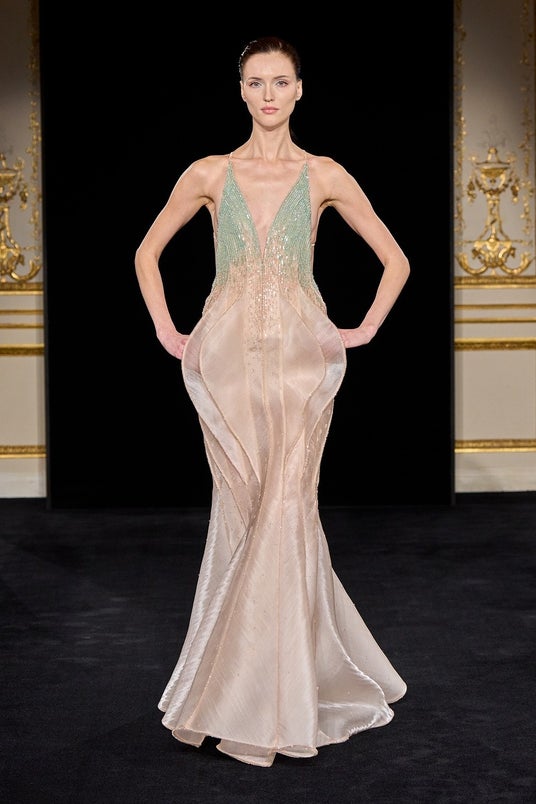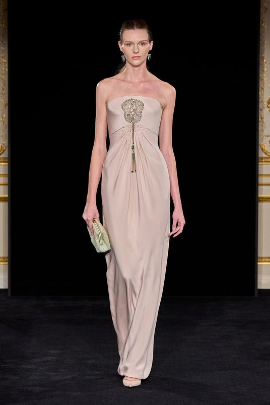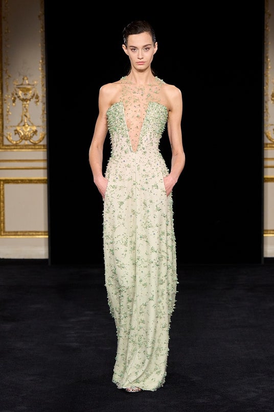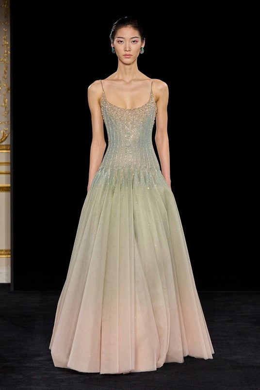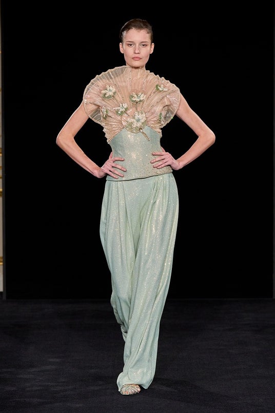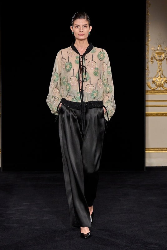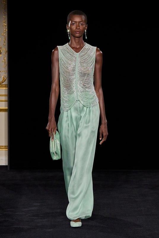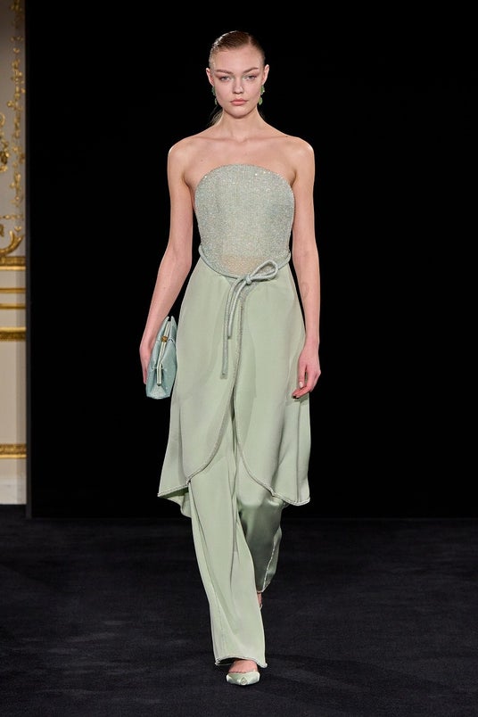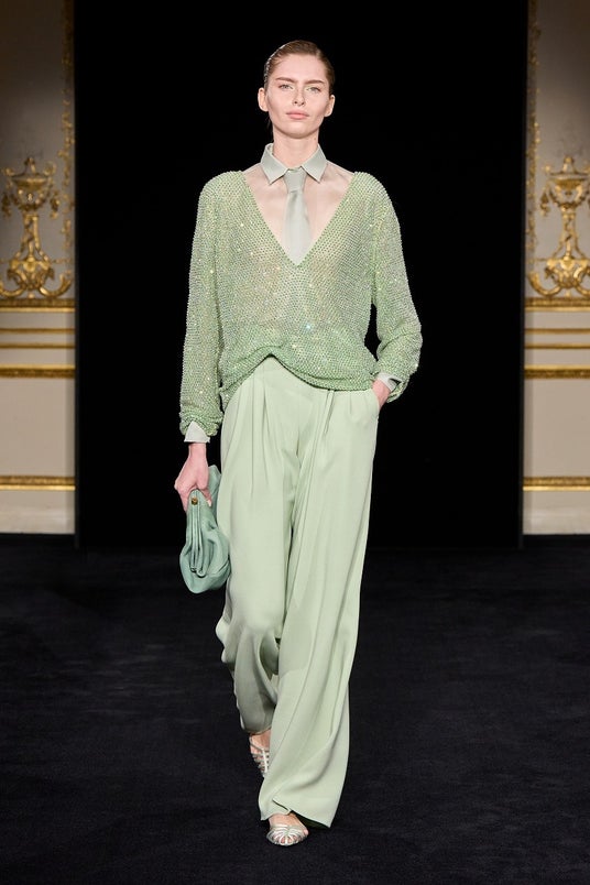 翡翠(ジェイド)を思わせるグリーン、ピンク、ホワイトの繊細な色調は、ブラックのグラフィカルなコントラストによって際立ち、コレクション全体に奥行きをもたらします。サテンやシルクによる流れるような縦のラインがシルエットと調和し、ジョルジオ アルマーニ プリヴェらしい軽やかで洗練された印象を生み出します。
