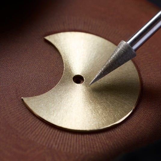 二層に重ねたダイヤルは、羽毛のように柔らかく細やかな模様を放射状に彫ることで、滑らかで絹のような質感と、光がたゆたうかのような優雅さを生み出しています。それぞれのダイヤルに繊細な彫金を施し、2層に重ねたとき、直線が途切れることなくつながるように仕上げるには、卓越した匠の技が求められます。