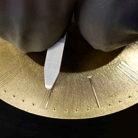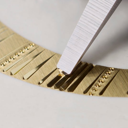 また、クレドールが誕生した1970年代に採用された、手書きの版下による繊細で優美なローマ数字のインデックスから着想を得た、シャープな極細のローマ数字のインデックスを彫っています。分目盛には、「魚々子(ななこ)」模様といわれる細かな円を一つひとつ彫り込み、精緻な美しさのなかにきらめきを与えるとともに、時刻の読み取りやすさも確保しています。