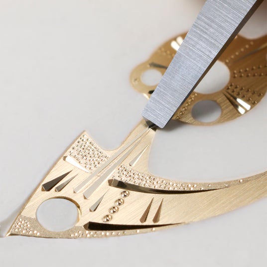 一般的な洋彫りの技法で曲線を彫った場合、光沢が弱くまた彫った面が荒れてしまうことがあります。また、和彫りで使われる一般的な彫刻刀は彫った面が美しく輝くのが特徴ですが、槌で彫刻刀を叩いて彫る和彫りの手法は、クレドールの薄くて小さいムーブメントのパーツを歪めてしまうため、不向きです。そのため、クレドールでは彫金師が、彫りたい模様や自らの手の形状に合わせた独自の彫刻刀(バイト)を自作し、長年にわたって鍛練を重ねることで、どの角度からも美しく輝く美しい彫金面を生み出します。