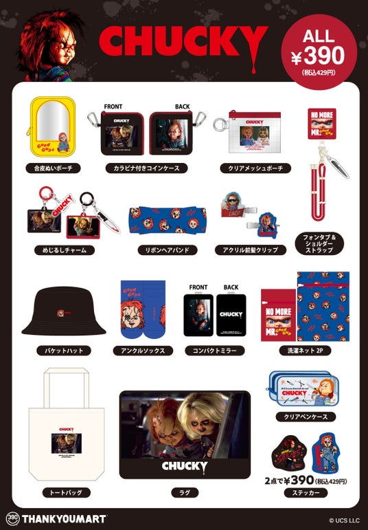 「Be Smile, Be Kawaii」をテーマに、キャラクターの限定アイテムを中心としたカワイイ推しグッズがいつ来てもALL390円で手に入るショップ「サンキューマート」は、映画『チャイルド・プレイ』に登場する史上最恐の殺人人形「チャッキー」とのコラボレーション雑貨を、全国のサンキューマート店舗で9月中旬より入荷次第販売開始いたします。