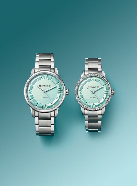 ケース素材にはステンレススチールを採用し、ブレスレット仕様に加え、38mmモデルではブラウンのレザーストラップ、29mmと34mmのケースには、ダイヤモンドをセットしたベゼルタイプも展開されます。ベゼルはポリッシュ仕上げ、ケース側面はサテン仕上げ、ラグ上面は外側のサテン仕上げと内側のブレスレットに隣接する部分にポリッシュ仕上げが施されています。これらの様々な技巧が光を捉えて反射することで、デザインに豊かな表情を与えます。ブレスレットは、中央の1列はサテン仕上げ、外側の2列はポリッシュ仕上げが施されています。ファセットを施したポリッシュ仕上げのリューズには、ティファニーのロゴがエングレービングされ、ティファニー ブルー のディスクがアクセントになります。ケースバックには、インスピレーション源であるアトラス クロックに敬意を表し、アトラスクロックと同じ書体のローマ数字がエングレービングされています。ケースの防水性は、従来モデルの5気圧から10気圧(100メートル/330フィート)へと向上しました。