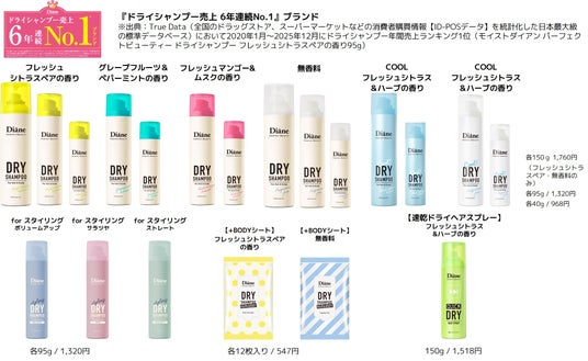 *出典:True Data(全国のドラッグストア、スーパーマーケットなどの消費者購買情報【ID-POSデータ】を統計化した日本最大級の標準データベース)において2020年1月~2025年12月にドライシャンプー年間売上ランキング1位(モイストダイアン パーフェクトビューティー ドライシャンプー フレッシュシトラスペアの香り95g)
