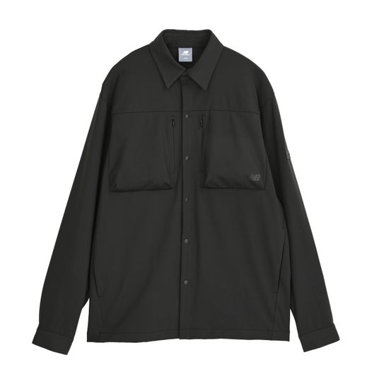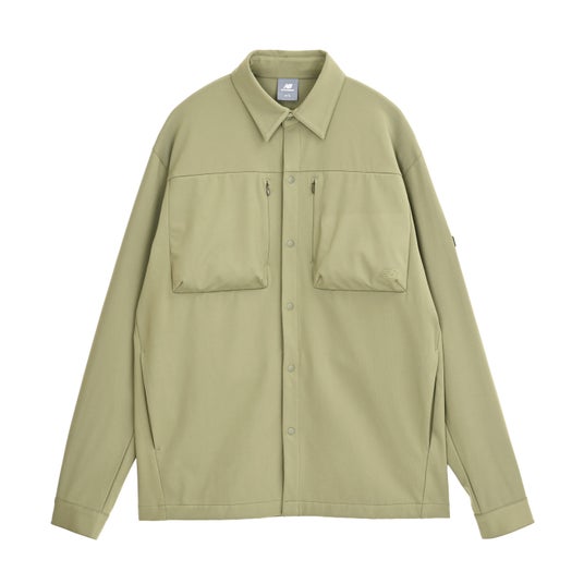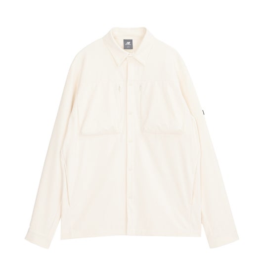 柔らかく心地よい肌触りのハイストレッチ素材を使用したオーバーサイズシャツです。ファスナー付きの左右ポケットや、左袖のNew Balanceロゴラベルがデザインのアクセントになっています。一枚着としても、羽織りとしても使える汎用性の高いアイテムです。