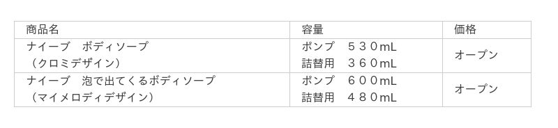“家族みんなのお肌を健やかに”というコンセプトのもと、洗う成分100%植物生まれの泡で、家族みんなの肌をやさしく洗い続けてきた「ナイーブ」。本年3月、子どもたちから大人まで愛され続けている大人気キャラクター「クロミ」・「マイメロディ」の限定パッケージを発売し、ご好評をいただきました。