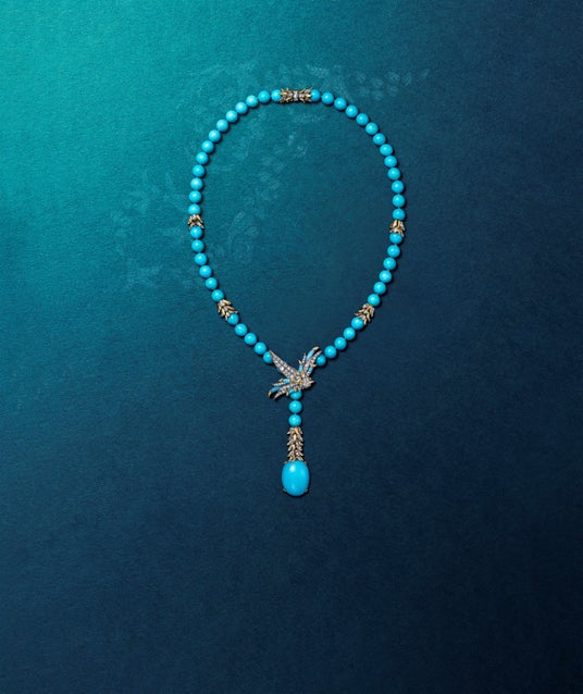 本コレクションには、ふたつの特別なハイジュエリーが含まれます。ひとつは、ティファニーが1968年に紹介した象徴的な「レガシー ジェムストーン」であるタンザナイトを主役にしたアイテムで、ひときわ輝きを放つネックレス、ブレスレット、イヤリングが揃います。もうひとつは、ティファニーのデザイン ヘリテージに深く根ざすターコイズを讃えるアイテムです。ターコイズは、ハイジュエリーにおいてダイヤモンドとの思いがけない組み合わせを取り入れたジャン・シュランバージェへのオマージュでもあります。カボション カットのターコイズが連なるネックレスにはゴールドとダイヤモンドの羽根がアクセントを添え、バードが抱えるドラマティックなターコイズのドロップがその魅力を一層際立たせています。ターコイズのアイテムにはペンダントやブローチ、そしてリングが揃い、それぞれ独創的なバード モチーフが表現されています。