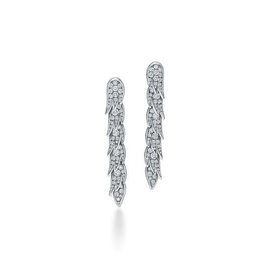 より抽象的に解釈されたウィングスのデザインは、ダイヤモンドがまるで宙に浮かんでいるかのようなセッティングで輝きを放ちます。リングは、重ね着けをすると、波打つような羽根のシルエットが美しく重なり合います。さまざま着け方ができるコンバーチブル ピアスは、華やかなドロップピアスから繊細なスタッズピアスとしても楽しめます。