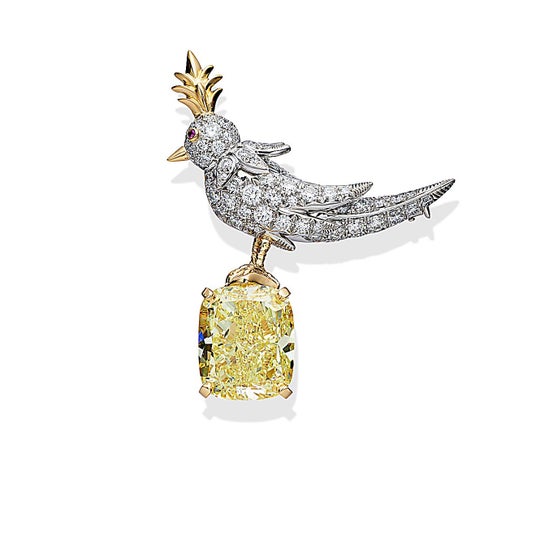 Jean Schlumberger by Tiffany & Co. Bird on a Rock brooch in platinum and 18k yellow gold with a Fancy Intense Yellow diamond of over 11 carats, white diamonds and a pink sapphire