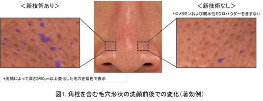 さらに花王は、20~30代の日本人男女9名を対象に、トロメタミンと親水性ミクロパウダーを配合した製剤およびどちらも配合していない製剤で左右半顔ずつの単回洗顔試験を実施しました。洗顔前後の写真から作成した鼻部3次元画像を用いて、角栓を含む毛穴深さの変化を解析*7した結果、新技術では洗顔によって深さが50µm以上変化した毛穴が多く認められました。これは、毛穴の奥に詰まっていた角栓が除去されたためだと考えられます。一方で、新技術なしでは変化はほとんど見られませんでした(図1)。また、新技術では洗顔前に比べて黒ずみ汚れが目立ちにくくなる様子も観察されました。