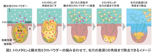 さまざまな成分を探索し、平均粒径数十µmの親水性ミクロパウダーをトロメタミンと共に配合したところ、ほぐれた角栓が親水性ミクロパウダーに吸着することで、角栓が分散しやすくなることを見いだしました。これにより、トロメタミンが毛穴の奥深くの角栓まで作用し、除去できるようになると考えられます(図2)。
