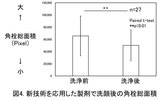 これらの結果から、新技術では毛穴の奥深くの角栓まで除去できるようになり、それによって黒ずみ汚れが目立ちにくくなることが示唆されます。