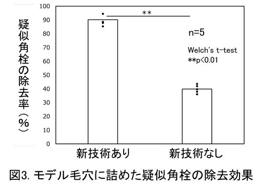 *5 61個のモデル毛穴がある基板に疑似角栓を詰め、新技術ありと新技術なしの製剤を滴下して洗浄した前後の重量変化を測定。5回試験を実施し、モデル毛穴の奥深くまで疑似角栓を除去する性能を評価