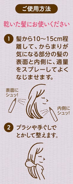 ●時間がない朝に、ブラシや手ぐしでとかすときも痛くない、からまり・ひっかかりが気になる毛先までクシどおりスルンとサラサラ髪に導きます。
