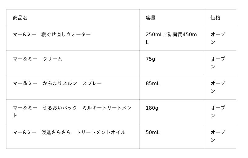 朝のスタイリング時に使う、手ぐしでサッとまとまる「寝ぐせ直しウォーター」、肌にも使えるまとめ髪用の「クリーム」、ひどいからまりもスルンとほどける「からまりスルン スプレー」、夜のお風呂あがり・ドライヤー前に使う、うるおいを閉じ込め、からまりや寝ぐせがつきにくくなる「うるおいパック ミルキートリートメント」、すーっと浸透して乾かしやすく、ツヤツヤまとまる「浸透さらさら トリートメントオイル」と親子ならではの髪悩みに応えるラインアップです。