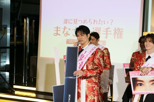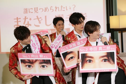 トークショーでは、「ぱちぱち」まつ毛の日にちなみ、「だれのまなざしが一番魅力的で、見つめられたいか」を決定する「まなざし選手権」が開かれました。この日のために撮影された、メンバーの目のドアップのパネルが用意され、メンバー同士で最も魅力的な目だと思う人を指さすと、元Jリーガーのメンバー・青山さんが満場一致で1位に!