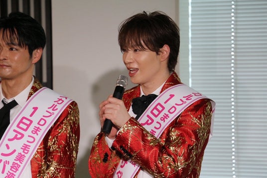 アンバサダー就任のタスキ授与をされ、メンバーの塩田さんは「僕たちSHOW-WAとして初めてのアンバサダー就任式なので、今日一日盛り上げられるように頑張ります!皆さんシワはないと思うんですが、ぜひクイーンを使って、まつ毛を伸ばしたりシワの改善をしてください!今日も僕も使ってきました!」と意気込みを語りました。