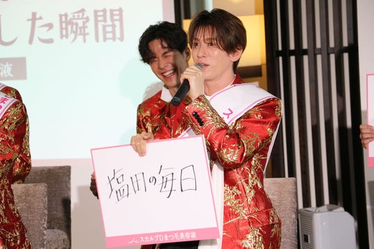 リーダーの寺田さんは、8月8日が父親の誕生日であると、「ぱちぱちまつ毛の日」と縁が深いと話しつつ、「まつ毛だけではなく目尻のシワ、首のシワにも使っています。女性だけなく男性にも使用してもらいたい」と商品の魅力をアピール。イベントを締める一言を振られると、「ハイタッチ会とか、ファンの皆様と接触する機会が多いんですが、皆様もまつ毛美容液クイーンを使って、僕に「まつ毛が伸びたよ」とお知らせをしてね!お互いに確認しましょう。接触しましょう!」と、独特な表現で、「スカルプDまつ毛美容液」の1日アンバサダーとしての職務を果たされました。