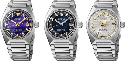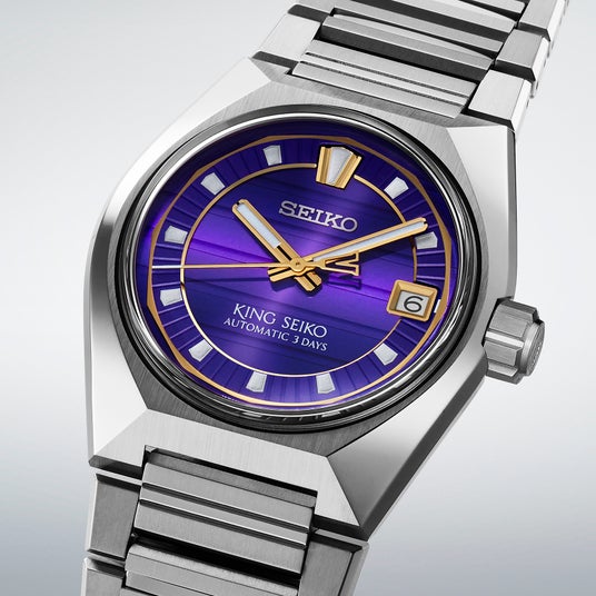 レギュラーモデル3種は、時間の移ろいによって変化する、現代の東京の景色をダイヤルで表現しました。それぞれ「夕暮れ時」「真夜中」「日の出」を表現した、パープル、ネイビー、シルバーの3色のダイヤルをそろえています。そして、セイコーブティック専用モデルは燦燦と光が降り注ぐ東京の景色からインスピレーションを得たアイスブルーのダイヤルカラーを採用しました。さらに、数量限定のゴールドカラーダイヤルモデルは、東京の広大な地平線から昇る荘厳な朝日をモチーフにし、ダイヤルのセイコーロゴと裏ぶたのキングセイコーのロゴもゴールドに揃えています。