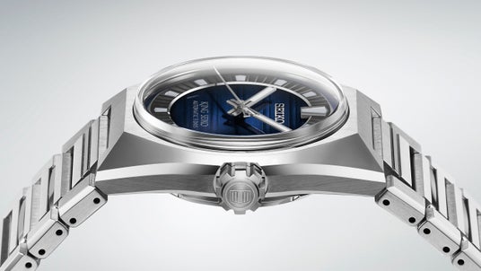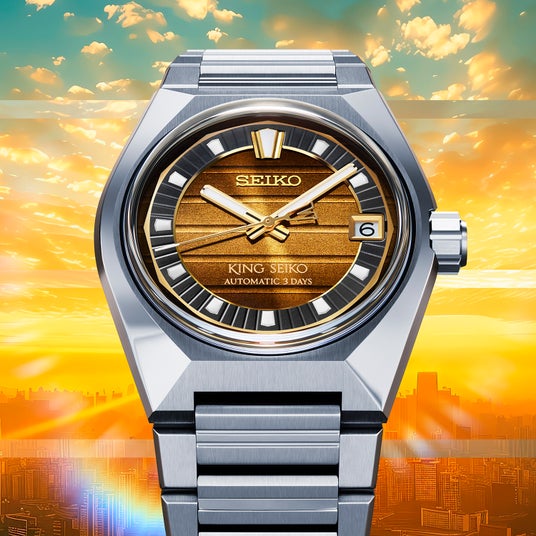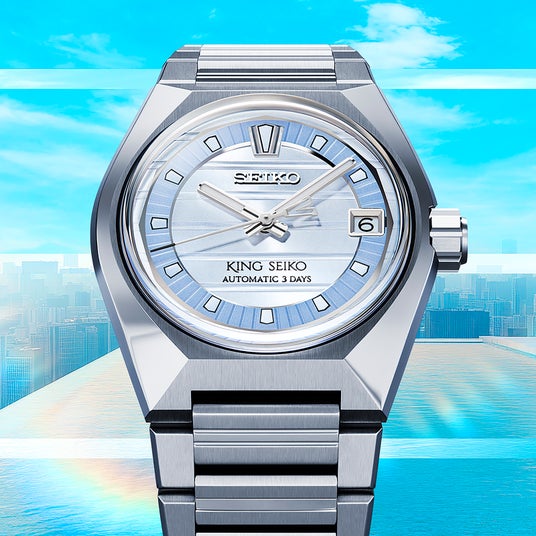 キングセイコーは1961年、東京・亀戸の第二精工舎で誕生しました。本作は、その東京から望む地平線をコンセプトに、ケース、バンド、ダイヤルをデザインしています。金属の塊を削り出したかのような重厚さを持つケースは、ベゼル(ガラス縁)のないデザインにすることで、伸びやかな表情も併せ持っています。また、高度な研磨仕上げにより、歪みのない鏡面に仕上げました。そして、ケースと滑らかにつながる新開発のブレスレットは、鏡面仕上げとヘアライン仕上げのこまを短いピッチで組み合わせ、水平のラインが際立つデザインにするとともに、高級腕時計にふさわしい着け心地を実現しています。