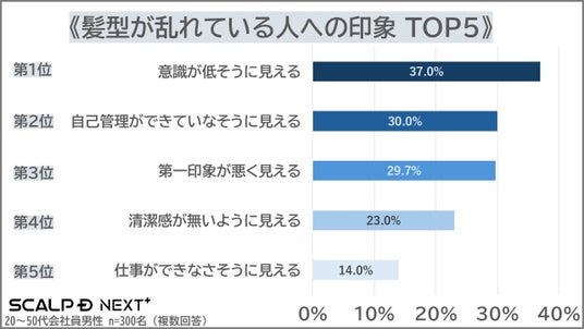 第一印象はビジネスシーンでも極めて重要な要素です。中でも「髪型」は視線が集まりやすく、相手の印象を大きく左右します。そんな中、髪型の乱れがどのような印象を与えるのかを調査した結果、最も多かった回答は「意識が低そうに見える」で37.0%に達しました。続いて「自己管理ができていなそうに見える」(30.0%)、「第一印象が悪く見える」(29.7%)となり、髪型の乱れが仕事への取り組み姿勢そのものを疑われる要因となっていることが判明しました。現代のビジネスシーンでは、髪型が「仕事ができる人」の重要な判断基準の一つとして機能していることが浮き彫りになりました。