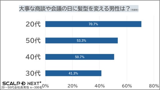 20代では、大事な商談や会議がある日に髪型のセットを変える人の割合が他世代を大きく上回り、約7割が髪型を変えていることが判明しました。