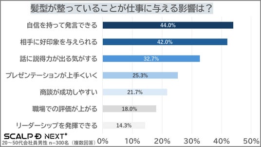 髪型がビジネスにおいて重要な印象要素だと思うかという質問に対し、実に78.0%(234人)が「重要だと思う」と回答。さらに、髪型が整っていることで仕事に与える具体的な効果として、最も多かったのは「自信を持って発言できる」で44.0%、続いて「相手に好印象を与えられる」(42.0%)という結果となりました。