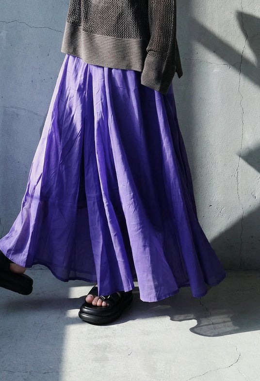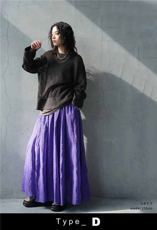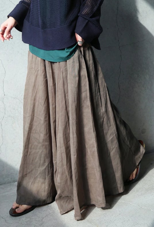 深みのある色合いが落ち着きをつくり、動くたびに揺れるスカートが柔らかさを添える。