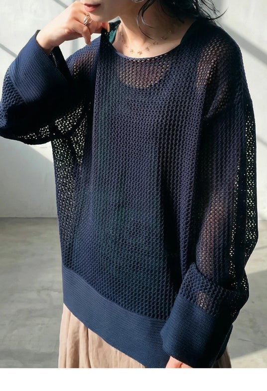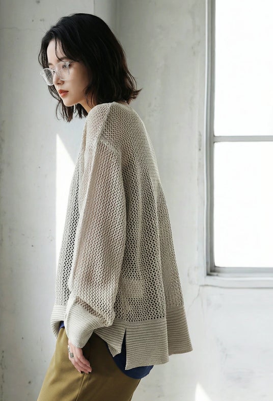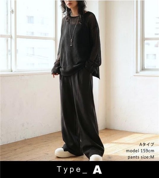 落ち感あるワイドパンツが縦のラインを強調し、メッシュの透け感が軽さを添える。