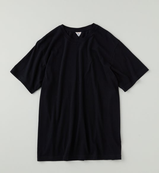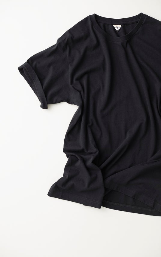 本商品の素材には、世界三大高級綿のエジプト産エクストラロングステープル(超長繊維)ギザコットンを原料に、丸編みの産地である和歌山でもトップクラスのニッターにより、別注の編み機で作り上げられたFilMelangeを代表する素材「ニューリンダ天竺」を使用しています。超長綿特有の滑らかなシルキータッチによる極上の肌触り。緻密な度目調整により、タフさと上品な光沢を両立しました。