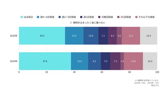 腕時計の着用頻度は「ほぼ毎日」が33.3%で最多、2014年から概ね変化なし