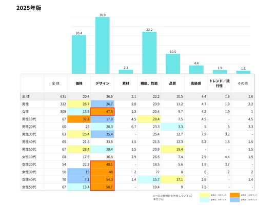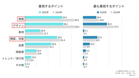一方で、最も重視するポイント(n=631)を見ると、全体の1位は同じく「デザイン(36.9%)」であったものの、2014年には2位だった「価格」を抜き、「機能・性能(22.2%)」が2位に浮上するという変化が見られた。スマートウォッチの普及により、時計で何ができるかという実用性が求められるようになっていることが伺える。
