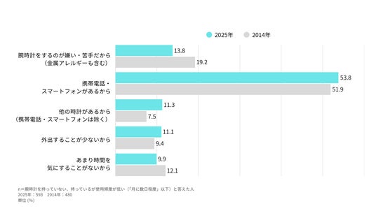 腕時計をあまり身に着けない/持っていない理由<全体比較>(n=593)