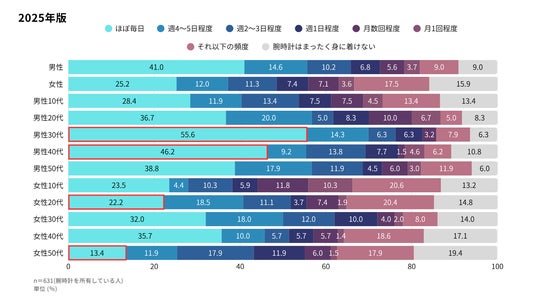 「ほぼ毎日」着用する層を性年代別(n=631)で見ると、男性30代~40代は約半数に上るのに対し、女性は全体的に着用頻度が低く、特に20代女性(22.2%)と50代女性(13.4%)で著しく低い傾向にある。