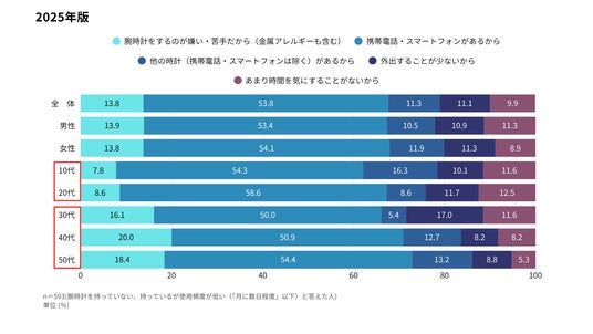 腕時計をあまり身に着けない/持っていない理由<年代別>(n=593)