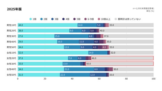 腕時計の所有数を性年代別(n=1,000)に見ると、特に20代~30代女性で非所有の割合が突出して高く、特に30代女性の半数(50.0%)が時計を所有していないことが明らかになった。