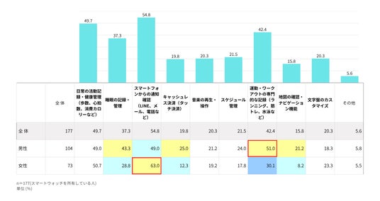スマートウォッチの利用用途に男女差あり、女性は「通知確認」としての利用、男性は「運動の記録」としての利用が多い傾向