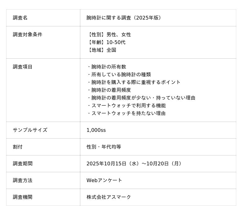 マーケティングリサーチ会社の株式会社アスマークは、全国の10~50代の男女1,000人を対象に、『腕時計に関するアンケート調査』を実施しました。その結果、全体の4割弱が腕時計を「持っていない」と回答し、2014年からの10年間で時計離れが加速している実態が明らかになりました。