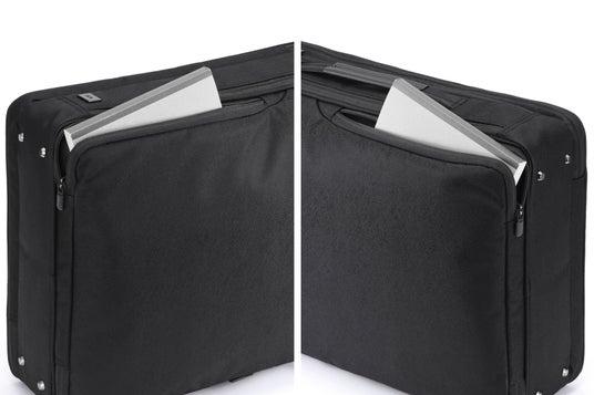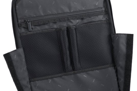 背面に、独立した「PC収納部」を備えています。内側のパイル生地がガジェットに細かな傷が付くのを防ぎます。