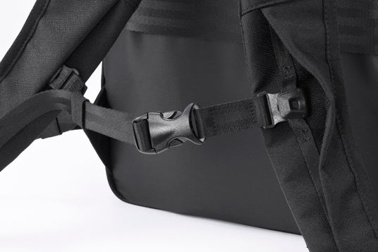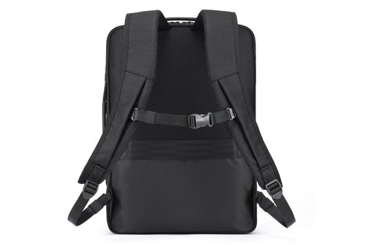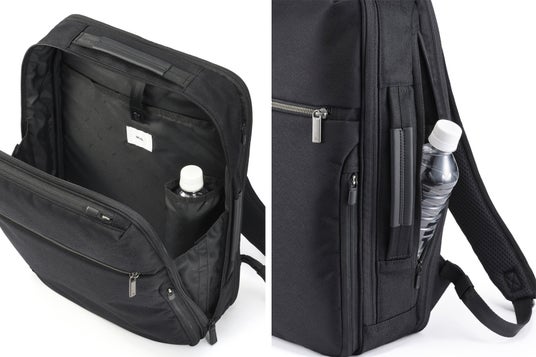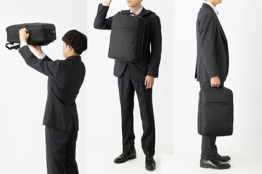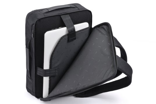 周囲だけでなく着用者にも邪魔になりにくい薄マチ形状ながら、書類やノートPCなどの荷物が効率良く入る無駄のないスクエア型で、容量をしっかり確保しています。