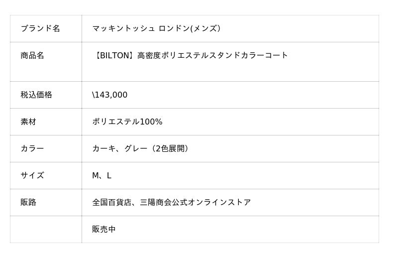 三陽商会が展開するブランド「MACKINTOSH LONDON(マッキントッシュ ロンドン)」メンズは、寒暖差に対応できる4wayアウター『BILTON(ビルトン)』を、「マッキントッシュ ロンドン」メンズを展開する全国百貨店54店舗と、三陽商会公式オンラインストア「SANYO ONLINE STORE(サンヨー オンラインストア)」にて販売を開始しています。