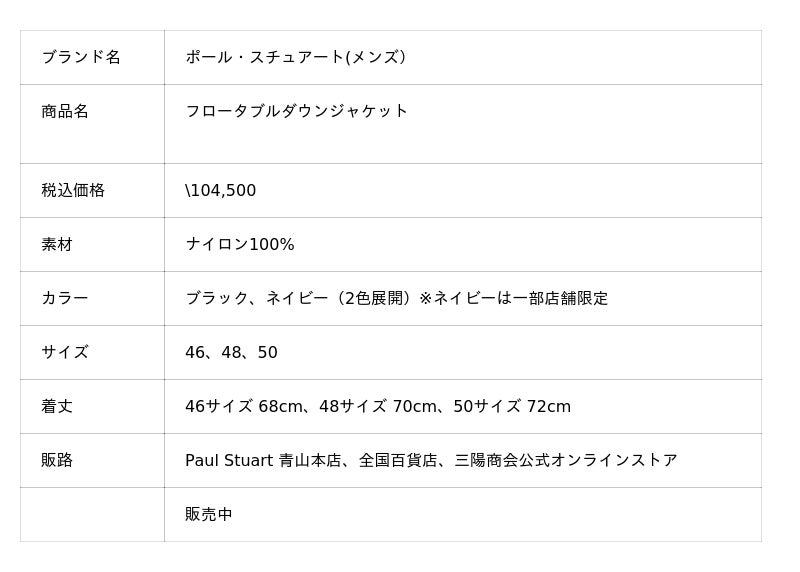 三陽商会が展開するブランド「Paul Stuart(ポール・スチュアート)」メンズは、圧倒的な軽さを追求した『フロータブルダウンジャケット』を「ポール・スチュアート」メンズを展開する全国百貨店、直営店の計46店舗と、三陽商会公式オンラインストア「SANYO ONLINE STORE(サンヨー オンラインストア)」にて販売を開始しています。