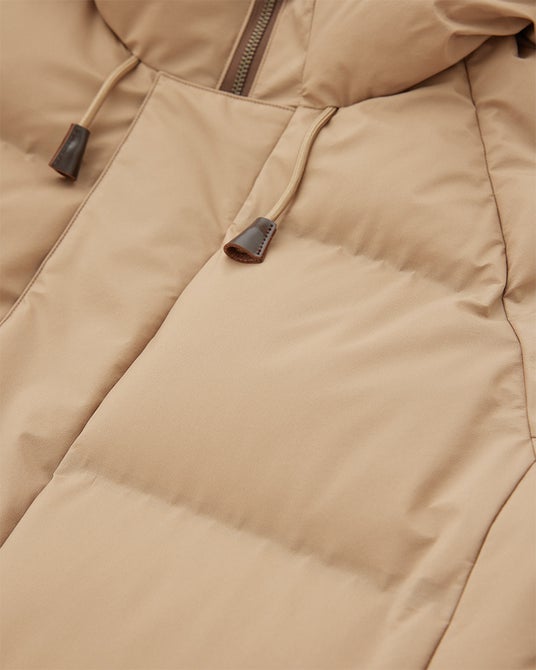 冬の装いにアクティブさと気品を添えるロングダウン。リサイクルナイロンを高密度に織り上げた三層構造素材は、透湿防水性に優れ、軽やかさと上質さを両立しています。青森産の高級羽毛を贅沢に充填し、シームレスな仕立てがロング丈ならではの端麗なラインを造形。ダウンでありながらスポーティ一辺倒に偏らず、比翼仕立てのフロントや着脱可能なフード、逆開仕様のエクセラファスナーが、品格ある佇まいを演出します。大人の冬にふさわしいエレガンスと、確かな機能性を備えた一着です。
