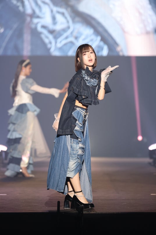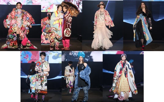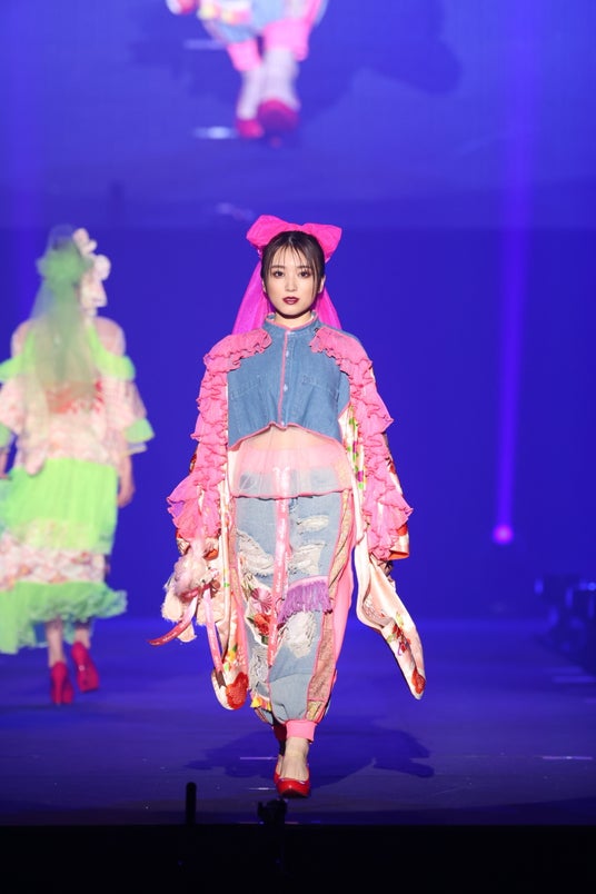 続けて、元Candystripperデザイナーの菊地千春が手がける、デザイナーの“好き(ハート)”が凝縮された懐かしくて新しい「ハイパージャパンリメイクブランド」Mother's made(マザーズメイド)のステージには、「Crossover」をテーマに、カジュアルな洋服に日本伝統の着物の生地を一部組み込んだ華やかなリメイク衣装で、メインアーティストとしても登場したDXTEENから、大久保波留、寺尾香信がペアでサプライズ登場した他、矢吹奈子がオリジナルのヘッドピースが印象的なコーディネートで登場し、会場を盛り上げました。