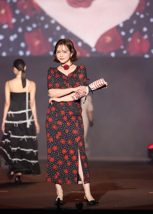 続けて、AKB48の1期生として国民的人気を博し、卒業後は、タレント、モデル、アーティストとしてマルチに活躍する板野友美がディレクターを務めるライフスタイルブランドで、“花々が輝く”という意味が込められたブランド名の通り、誰かと比べるのではなく、自分を愛し、たくさんのお水や肥料を与えて素敵なあなたを咲かせて欲しい。そして、女性がどんな時も前向きに一歩前進できる“きっかけ”を作りたいという想いが込められたプロダクトを展開しているRosy luce(ロージールーチェ)のステージには、トップバッターで、ディレクター板野友美自らが登場!村重杏奈はブランド名を象徴する花柄のワンピースで登場し、ランウェイを彩りました。