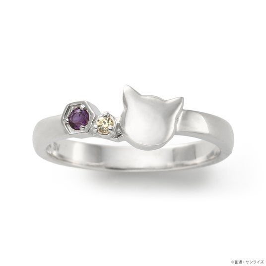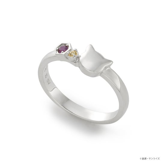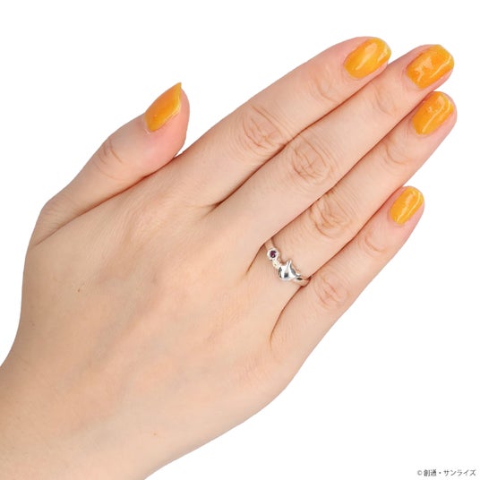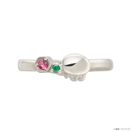 『機動戦士Gundam GQuuuuuuX』のアマテ・ユズリハ(マチュ)、ニャアン、シュウジ・イトウ、シャリア・ブルとシャア・アズナブルをイメージしたシルバーリングです。それぞれにクラゲ、ネコ、コンチ、中佐の胸章とヘルメットをモチーフに取り込んだゆるやかなV字ラインのデザインにイメージカラーストーンを2石セットしました。