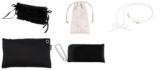上:SWEET 左から、フリルポーチ¥2,800(2色展開) リボンポーチ¥2,400(2色展開) グラスコード¥2,200(2色展開) 下:CHIC 左から、パフィポーチ¥1,600 チェーンポーチ¥1,800