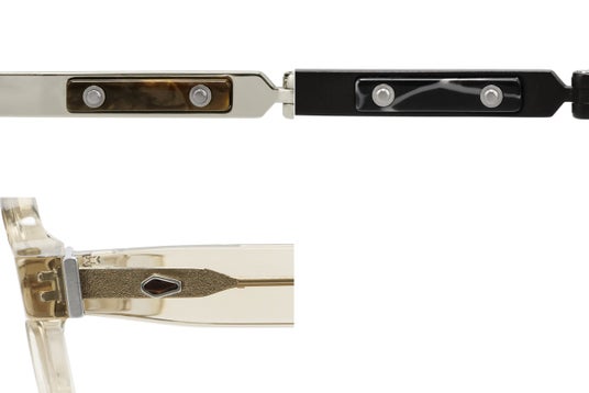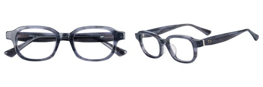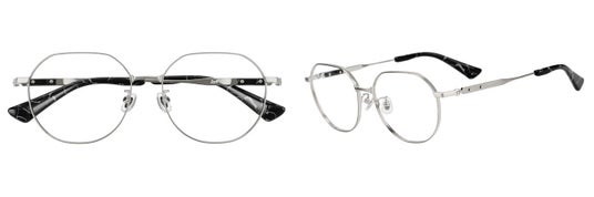 上:大理石のようなアセテート素材をカシメパーツとしてつるにプラス。(ZF252001_56E1 ZF252002_15F1)下:つる外側のダイヤ型パーツや、枠からはみ出るほど大きいメタルパーツで個性をプラス。(ZO251002_11A1)