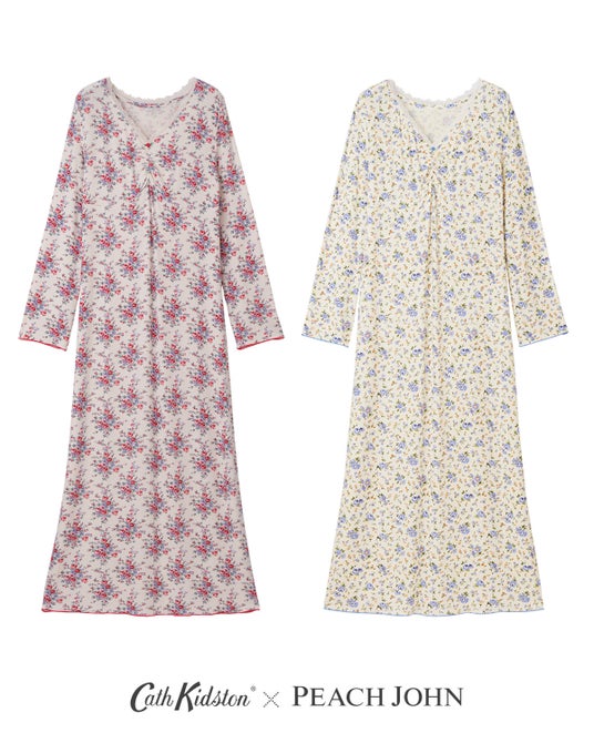 ルームウェア2型は、Cath Kidstonのシグネチャーである手描きプリントの総柄パジャマタイプとワンピースをラインナップ。
