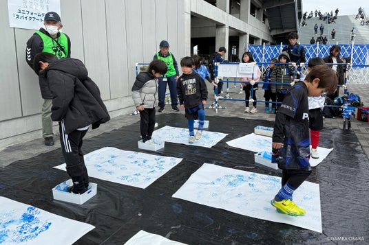 今年のEXPOユニフォームは、ユニフォームのデザイン自体を子どもたちの夢の場にしました。 第5節清水エスパルス戦の前に子どもたちがデザイン製作の場に参加。手のひらにペンキをつけてつくるフィンガーペインティングを応用し、サッカースパイクのスタッドにインキをつけて想い思いのアートを描いてもらいました。さらに、スパイクアートには福岡将太選手、宇佐美貴史選手、倉田秋選手、唐山翔自選手も参加しました。
